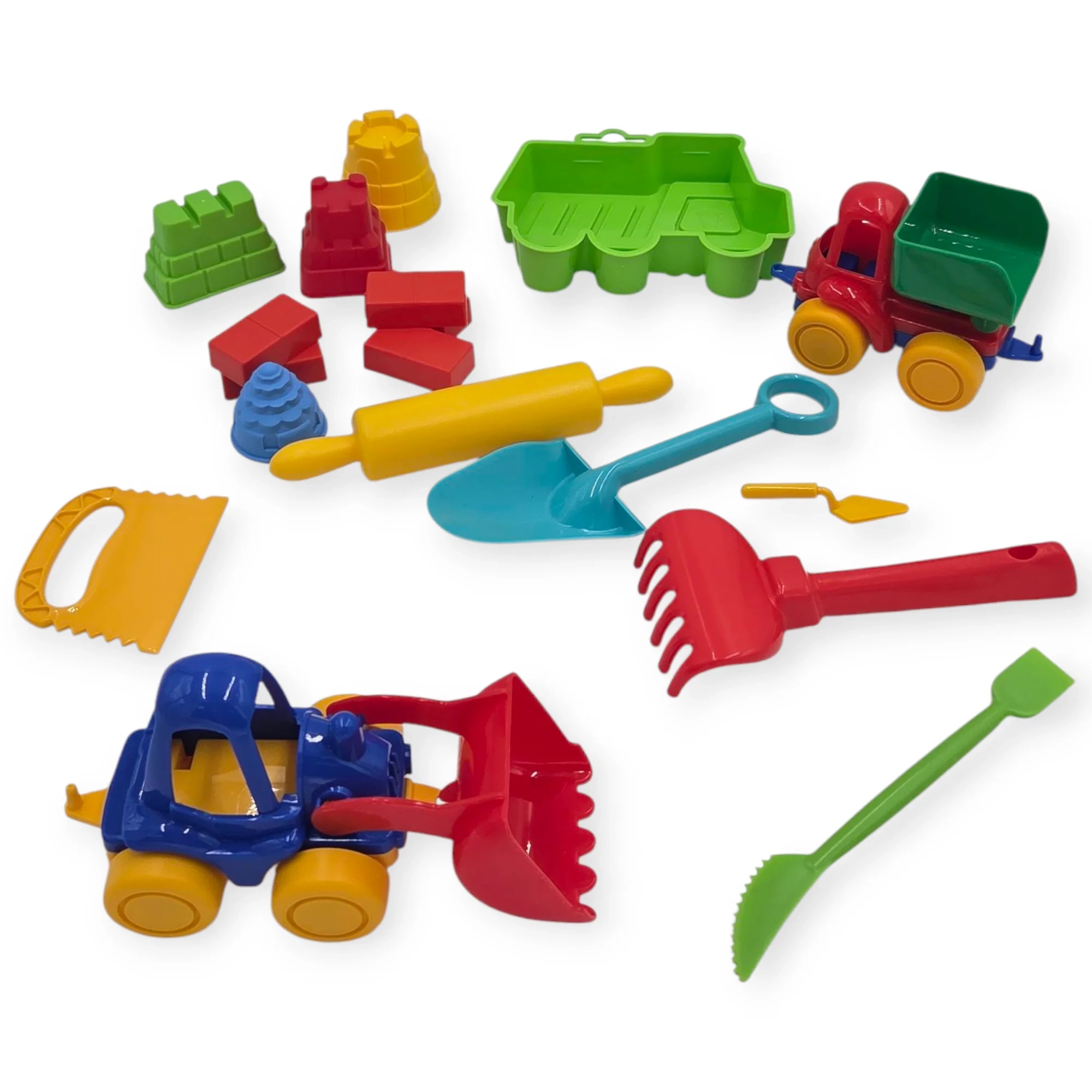 Rinkinyje yra 18 skirtingų prietaisų lipdymui: savivartė, traktorius su kaušu, platus peiliukas, 4 vnt. formelių, 5 vnt. plytų, kastuvas, didelis peiliukas, kočelas, mentele, grėbliukas, savivartės formelė.
