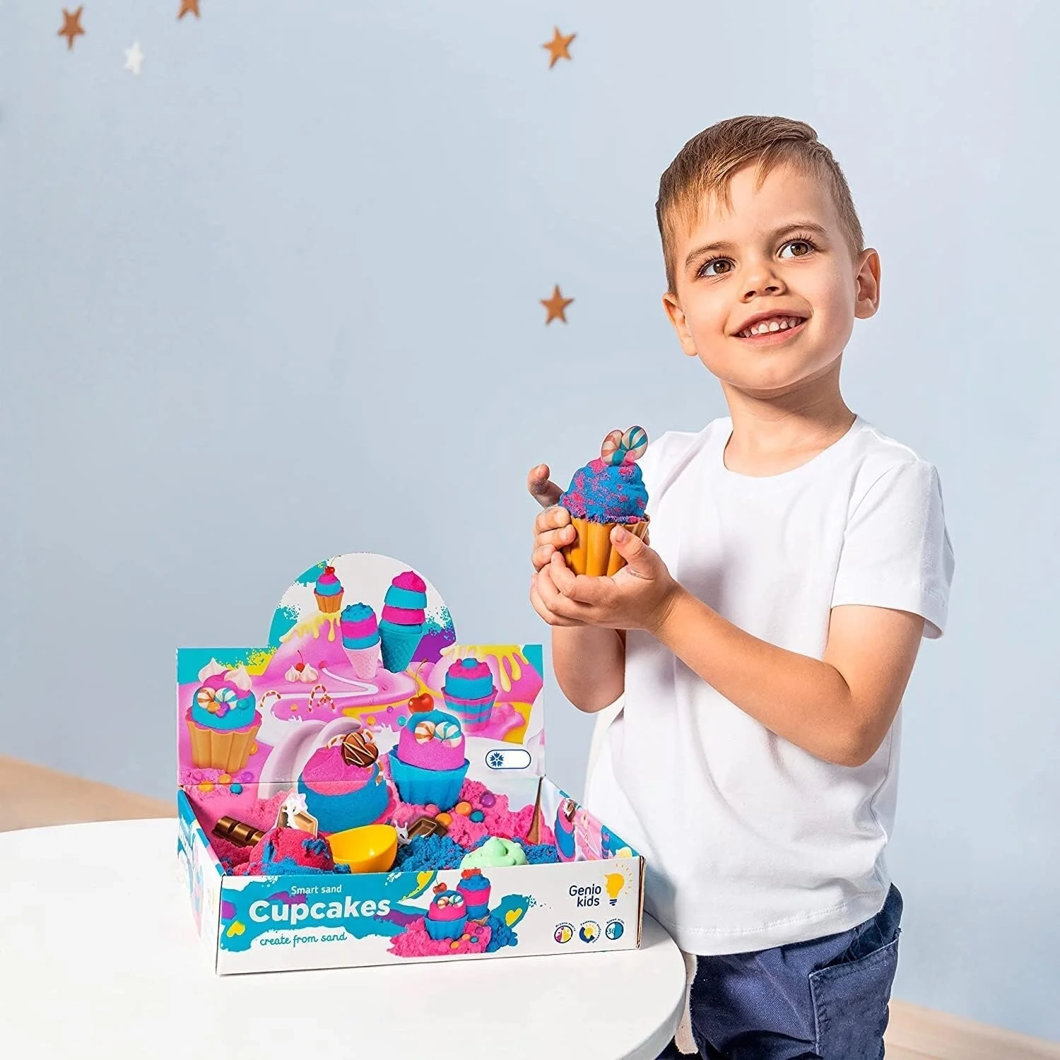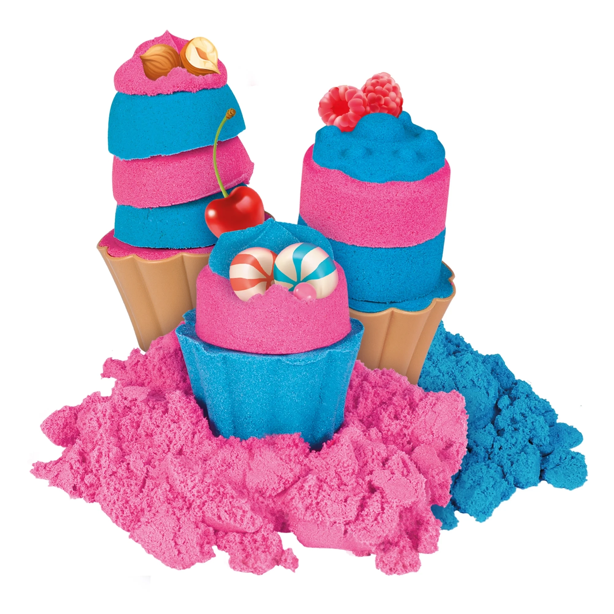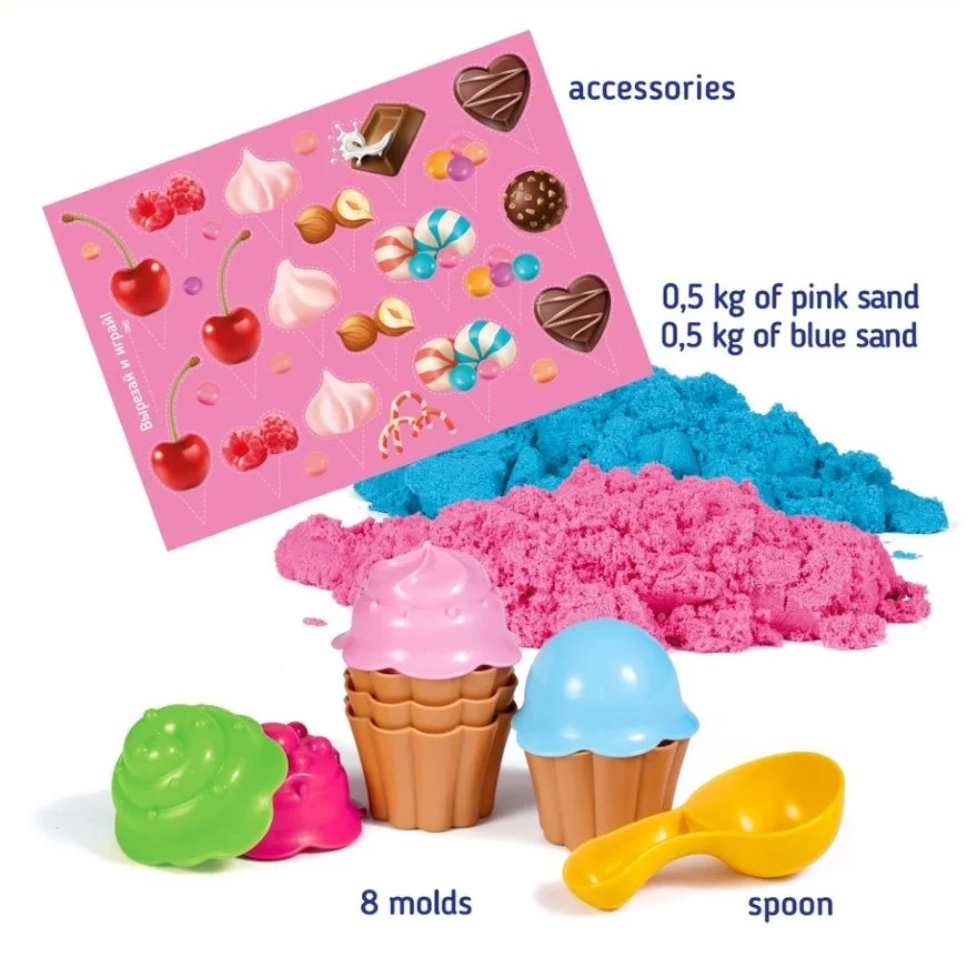Rinkinį sudaro: rožinis smėlis 0,5 kg, žydras smėlis 0,5kg, 4 plastmasiniai indeliai keksiukams, 4 plastmasinės keksiukų formelės, papuošimai, kuriuos reikia išsikirpti. Dėžutę galima naudoti vietoj smėliadėžės - labai patogu ir praktiška. O dėl dėžutės perforacijos per kelias sekundes smėliadėžę paversite gražiu padėklu. Išmanusis (kinetinis) smėlis gerai klijuojasi, tačiau nelimpa prie rankų, todėl lengvai išsiima iš formelės. Lavina mažąją motoriką ir lytėjimo pojūtį. Puikiai ugdo fantaziją ir kūrybinius gebėjimus. Žaidžiant su kinetiniu smėliu jūsų vaikas atsipalaiduos. Smėlis nepurvina, nelimpa prie rankų, nedžiūsta.
