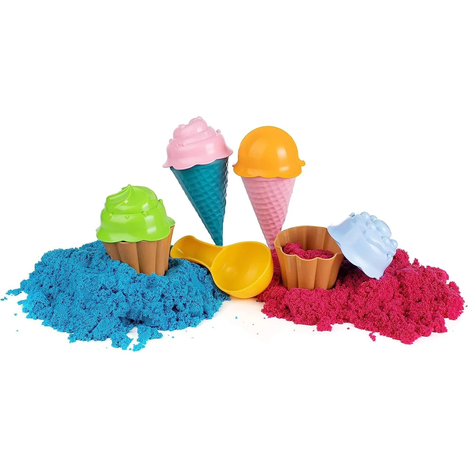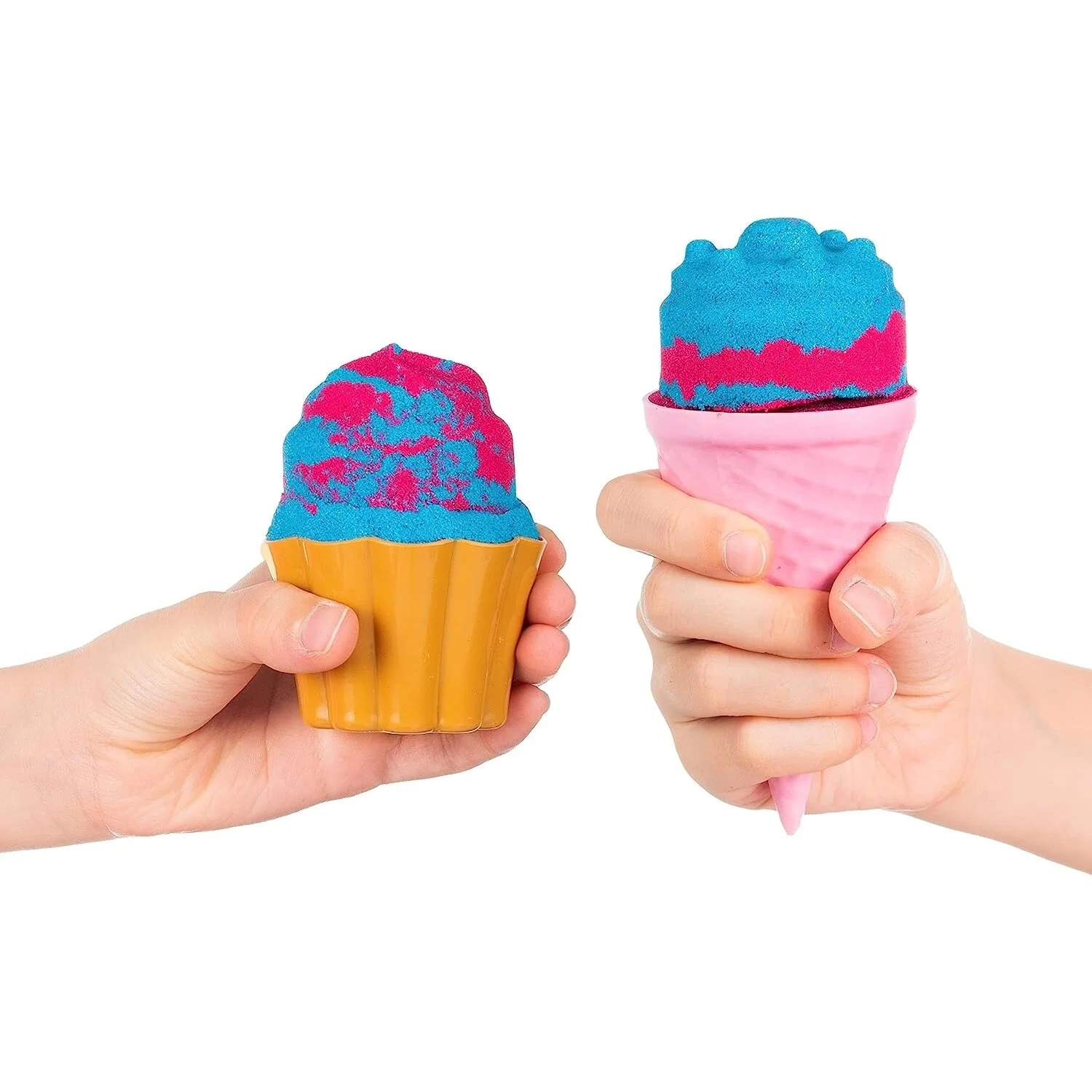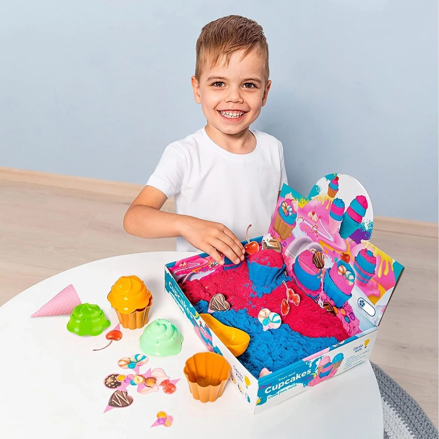 Rinkinį sudaro: rožinis smėlis 0,5 kg, žydras smėlis 0,5kg, 4 plastmasiniai indeliai keksiukams, 4 plastmasinės keksiukų formelės, papuošimai, kuriuos reikia išsikirpti. Dėžutę galima naudoti vietoj smėliadėžės - labai patogu ir praktiška. O dėl dėžutės perforacijos per kelias sekundes smėliadėžę paversite gražiu padėklu. Išmanusis (kinetinis) smėlis gerai klijuojasi, tačiau nelimpa prie rankų, todėl lengvai išsiima iš formelės. Lavina mažąją motoriką ir lytėjimo pojūtį. Puikiai ugdo fantaziją ir kūrybinius gebėjimus. Žaidžiant su kinetiniu smėliu jūsų vaikas atsipalaiduos. Smėlis nepurvina, nelimpa prie rankų, nedžiūsta.