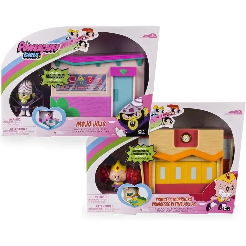 MOJO JOJO žaidimo rinkinyje yra beždžionės figūrėlė ir išlankstomas juvelyrinės parduotuvės modelis.