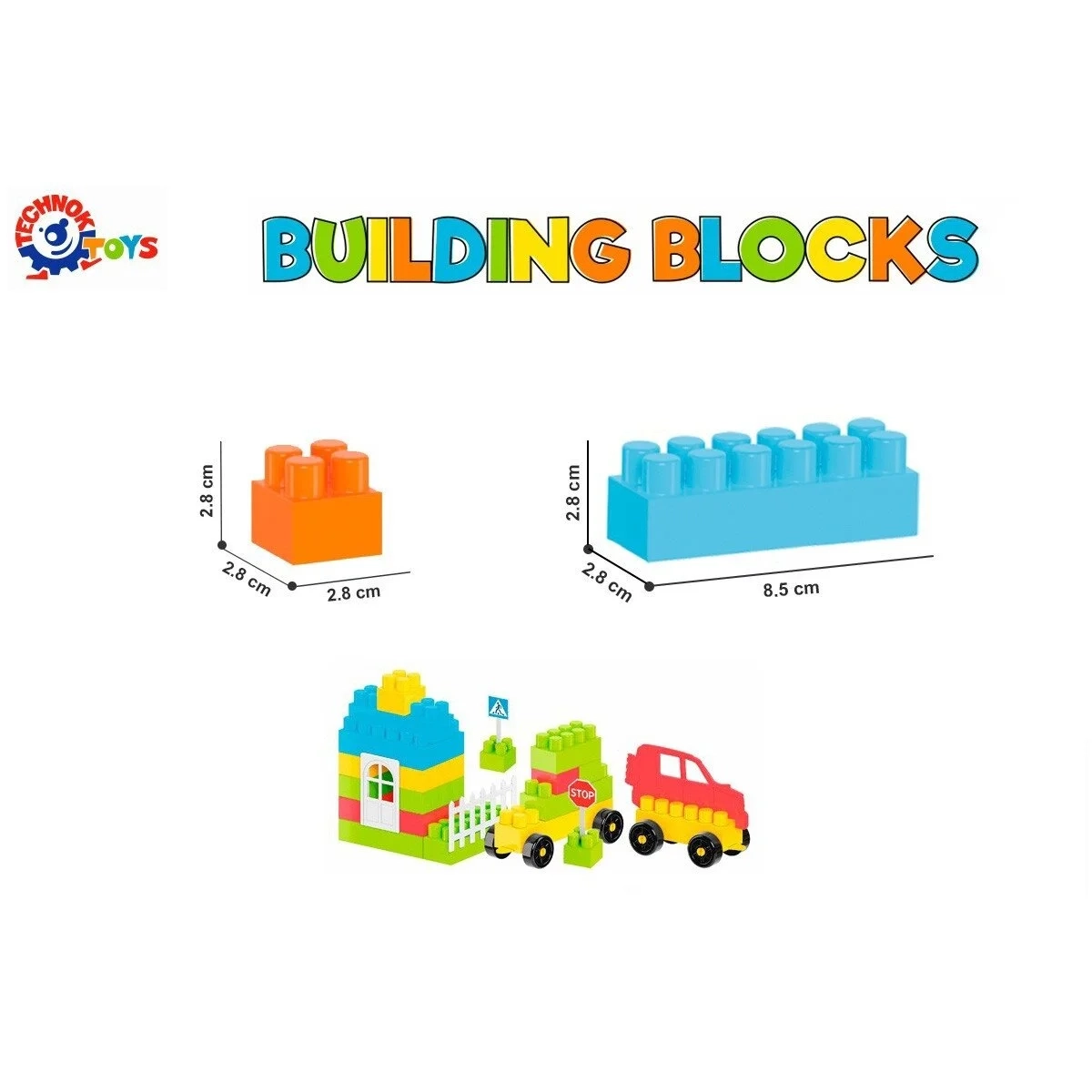 Rinkinį sudaro įvairių formų ir dydžių kaladėlės, langai, durys, tvoros bei kelio ženklai. Taip pat rasite automobilių figūrėles ir platformą su ratukais – puikų pagrindą kurti automobiliams, traukiniams, robotams ar kitiems judantiems modeliams. Tai leidžia vaikams konstruoti namus, pilis, garažus, transporto priemones ir viską, ką tik gali sugalvoti jų fantazija.