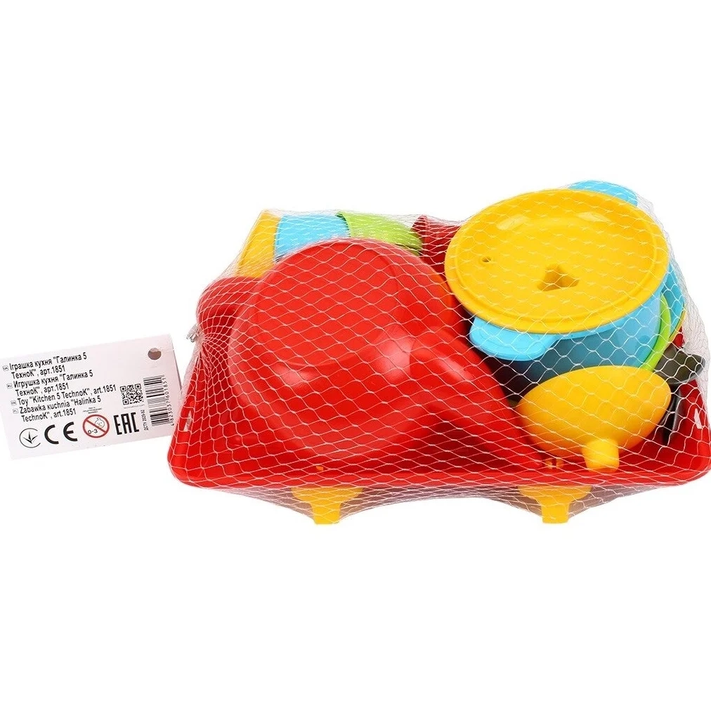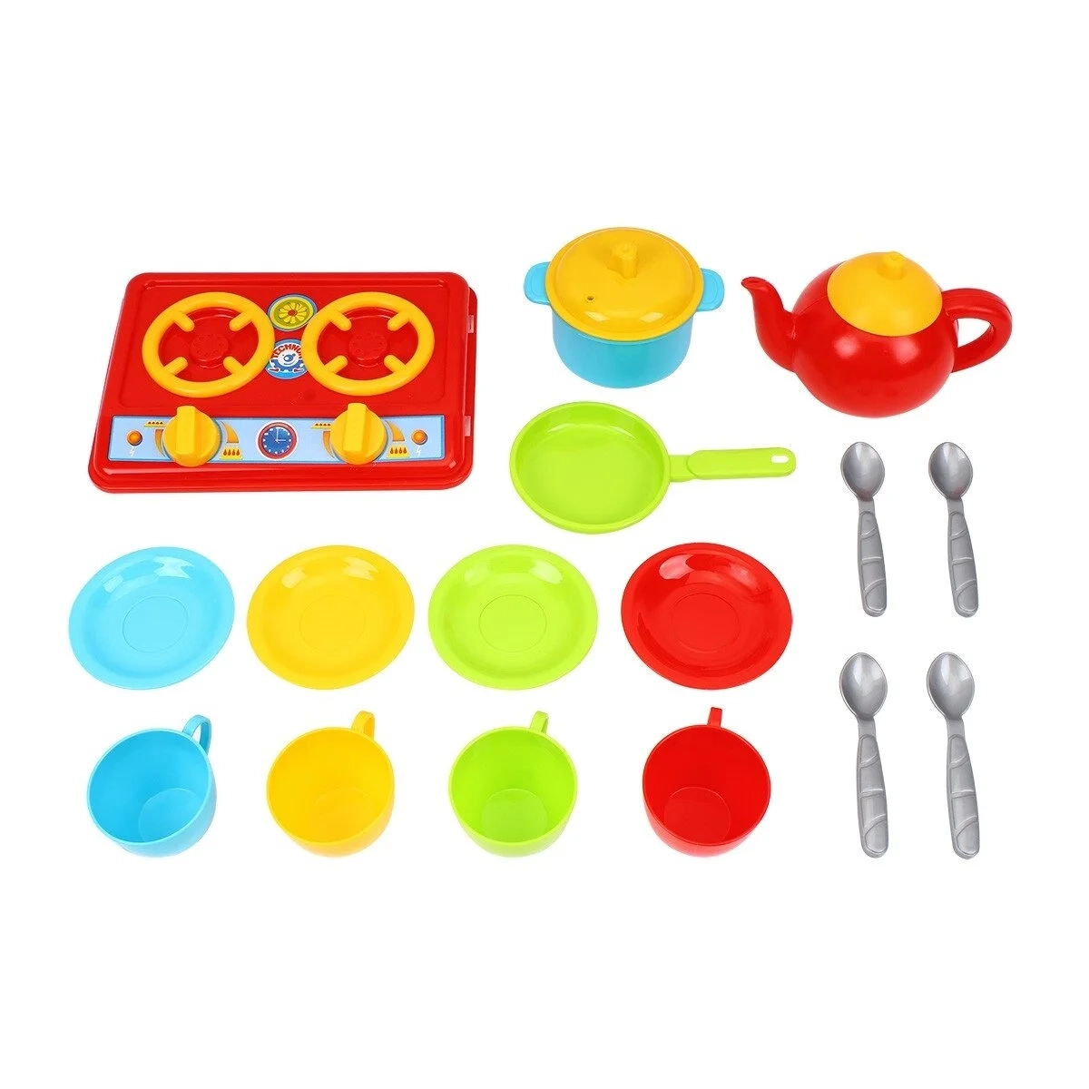 Rinkinį sudaro viryklė, 4 puodeliai, 4 lėkštutės, 4 šaukštai, virdulys, puodas ir keptuvė.