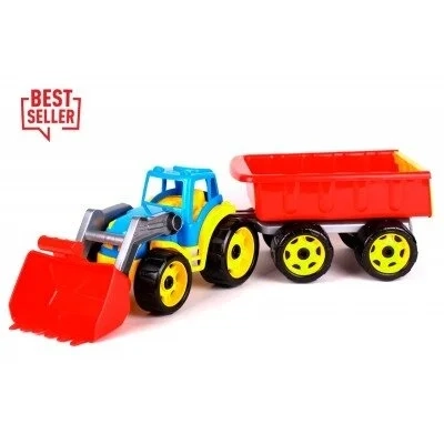 Traktorius su priekaba, skirtas žaisti tiek lauke, tiek namuose.