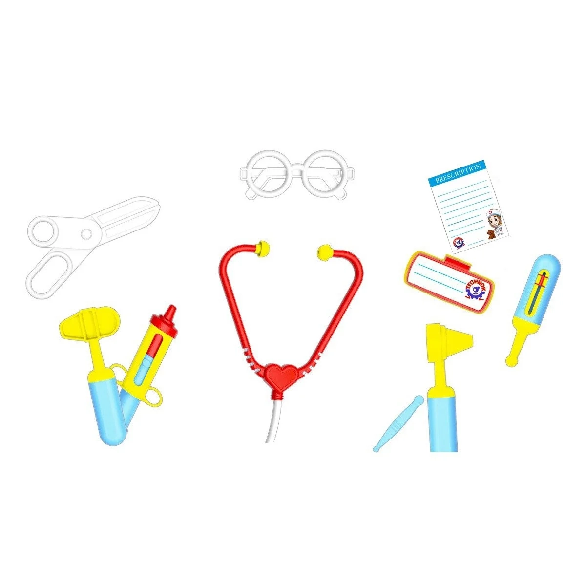 Rinkinyje – 10 populiariausių priemonių. Tarp jų: švirkštas, termometras, fonendoskopas ir kt. Jūsų vaikui taip pat patiks ženklelis ir recepto forma, o akiniai leis jam atrodyti kaip tikram gydytojui, kuris, turėdamas tokį priemonių rinkinį, neabejotinai „išgydys“ savo mėgstamą meškiuką nuo bet kokios ligos.