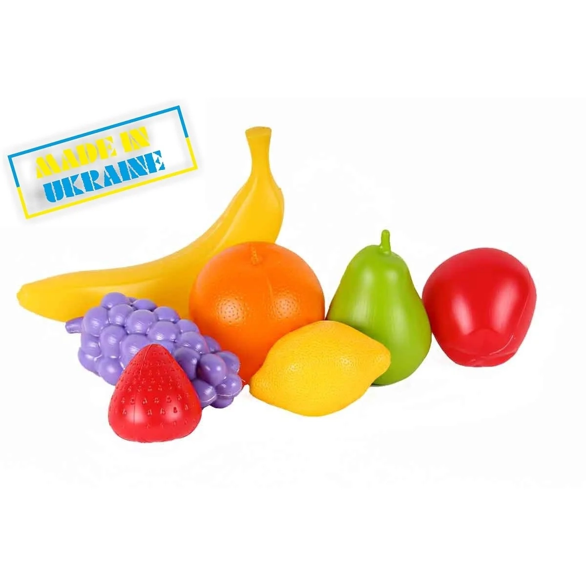 Rinkinyje – bananas, citrina, vynuogės, obuolys, kriaušė, apelsinas, braškė.