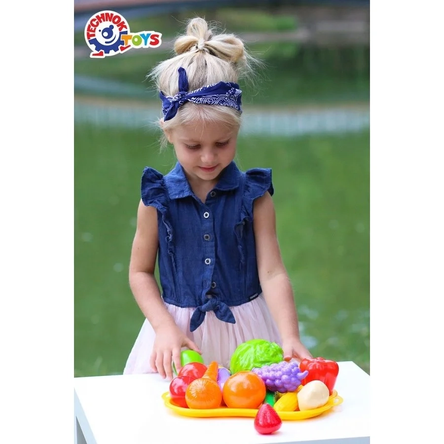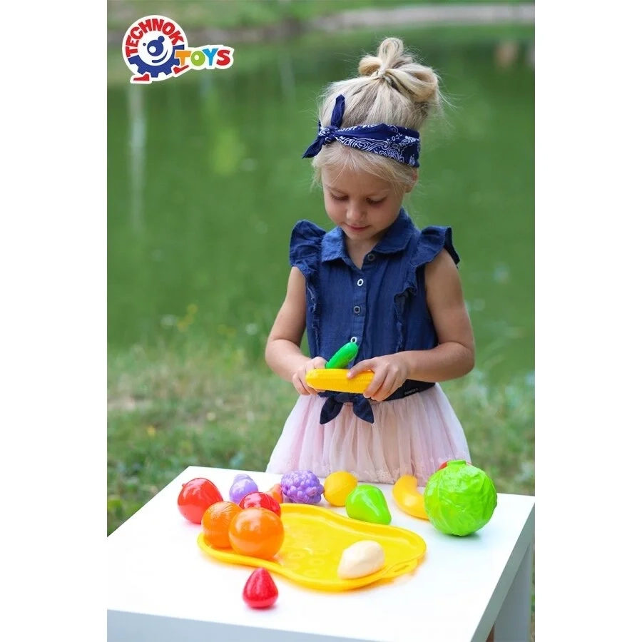 Rinkinį sudaro 16 vaisių ir daržovių ( bananas, citrina, vynuogės, obuolys, kriaušė, kopūstas, svogūnas....) ir padėklas: