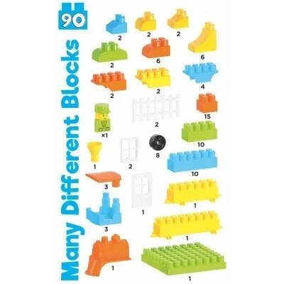 Konstruktoriaus rinkinyje yra 90 detalių. Tarp jų rasite detales, kurių pagalba bus galima sukonstruoti traukinį, laivą ar namą. sukurti tikrą didelį miestą.