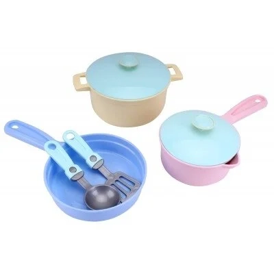 Keptuvė - 1 vnt.; didelis puodas su dangčiu - 1 vnt.; mažas puodas su dangčiu - 1 vnt. šaukštai - 4 vnt.; šakutės - 4 vnt.; lėkštės - 4 vnt.; puodelis - 4 vnt.; lėkštelės - 4 vnt.; keksų formelės - 4 vnt.; daržovės - 4 vnt.; dėžutės - 2 vnt.; virtuvės įrankių rinkinys; cukrinė su dangteliu, arbatinukas su dangteliu.