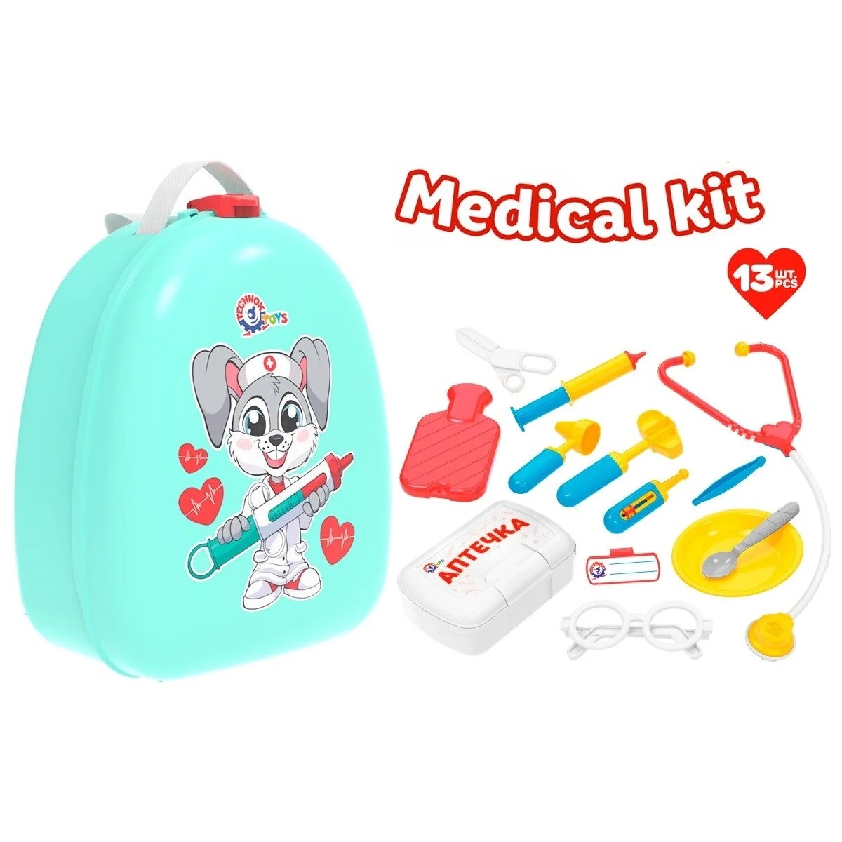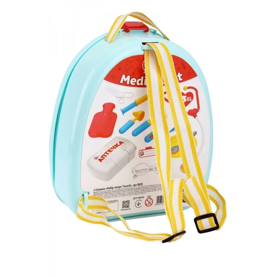 Rinkinį sudaro: pirmosios pagalbos vaistinėlė, žaislų gydytojo įrankiai, kuprinė.