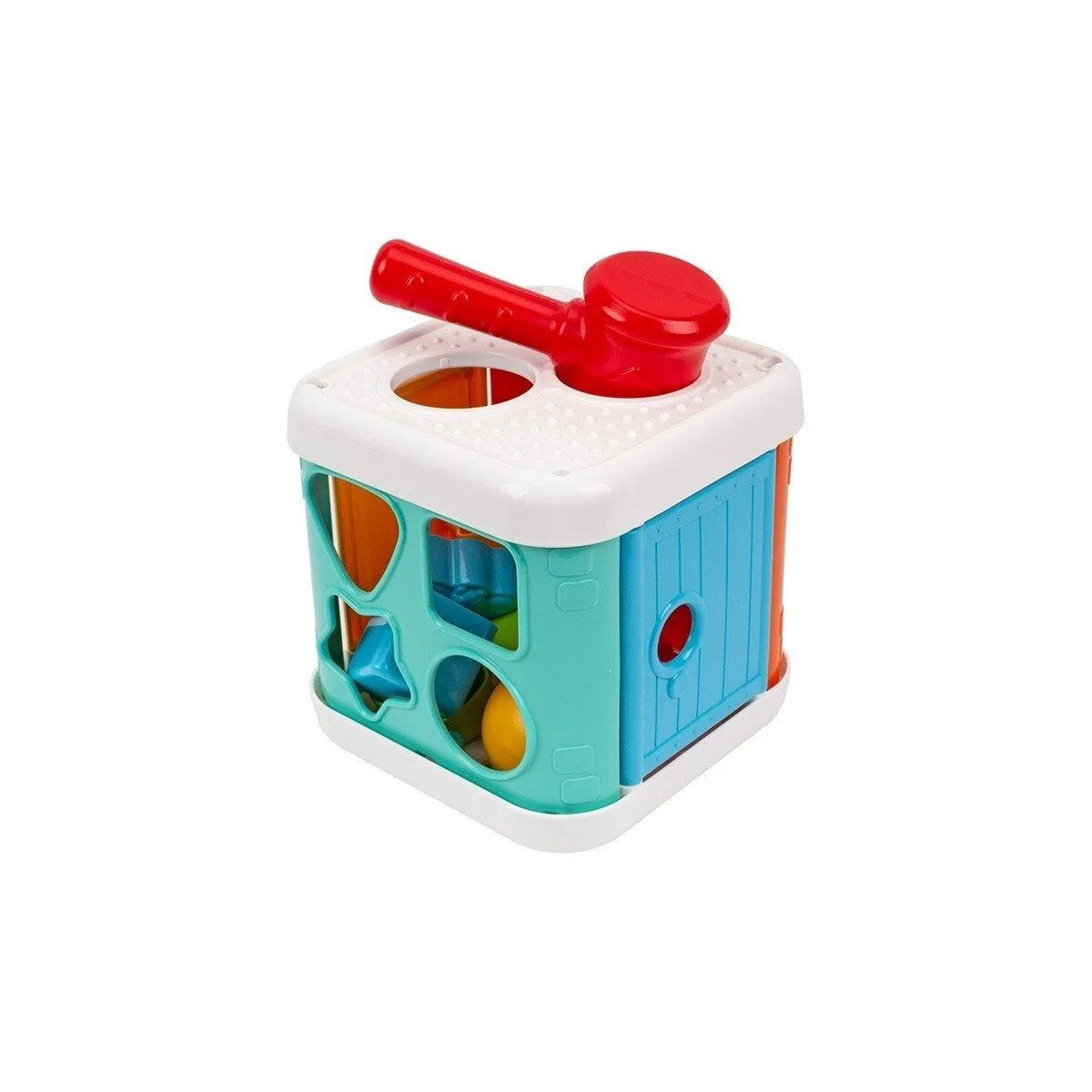 Kubas turi 6 sieneles. Dviejose sienelėse yra durys, kurios atsidaro į kubo vidų, Kubo viduje rasite geometrinių figūrų ir gyvūnų figūrų. Vaikas gali išimti figūrėles ir įdėti jas atgal į atitinkamas ertmes. Kitoje pusėje yra dvi ertmės, kad vaikas galėtų su plaktuku įkalti kamuoliukus į kubo vidų.