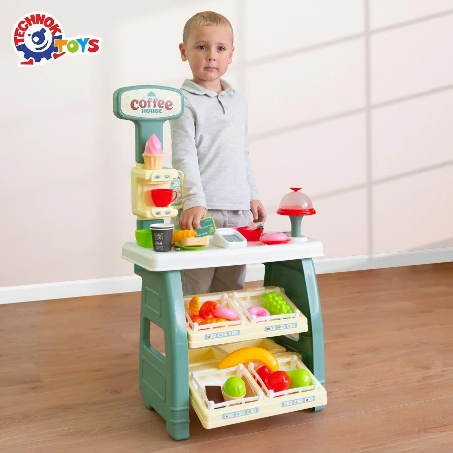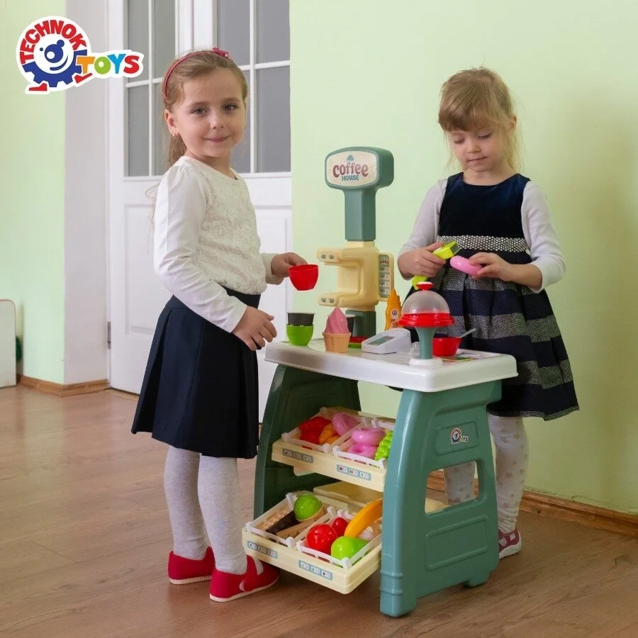 Rinkinys taip pat turi viską, ko reikia tikrai kavinės atmosferai sukurti: stilingus stalo įrankius, tortų stovus, meniu ženklą ir kavos virimo aparatą su dideliu stalviršiu. Erdviose lentynose tilps vaisių ir saldumynų dėžutės – visa tai padės surengti smagiausius „TechnoK Café“ susitikimus su draugais ar šeimos nariais.