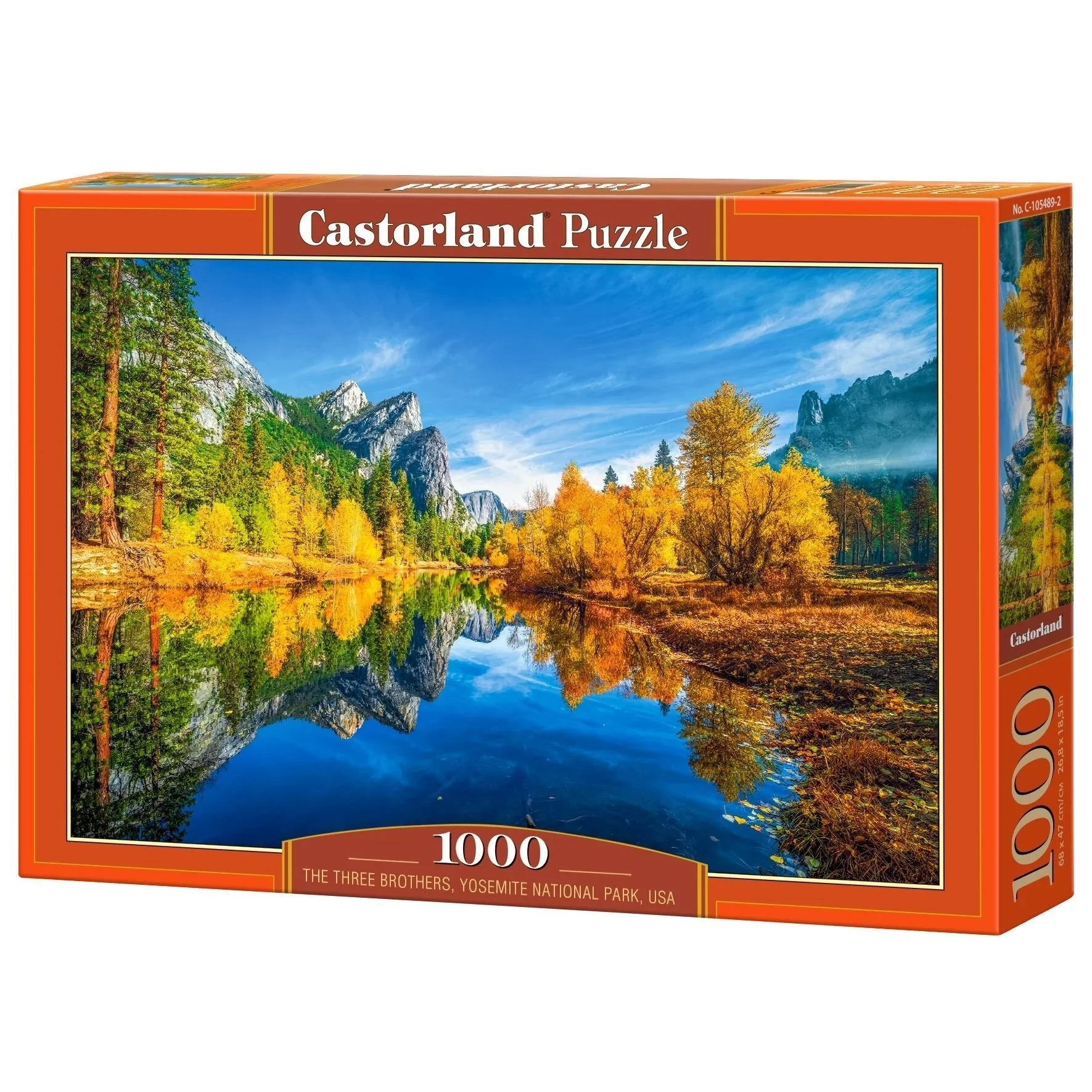 1000 detalių dėlionė, vaizduojanti legendines „The Three Brothers“ uolų formacijas Yosemite nacionaliniame parke, JAV. Rudens spalvomis nuspalvinti medžiai, kalnų atspindžiai ramiame vandens paviršiuje ir aiškios gamtos formos sukuria vizualiai turtingą, subalansuotą kompoziciją.