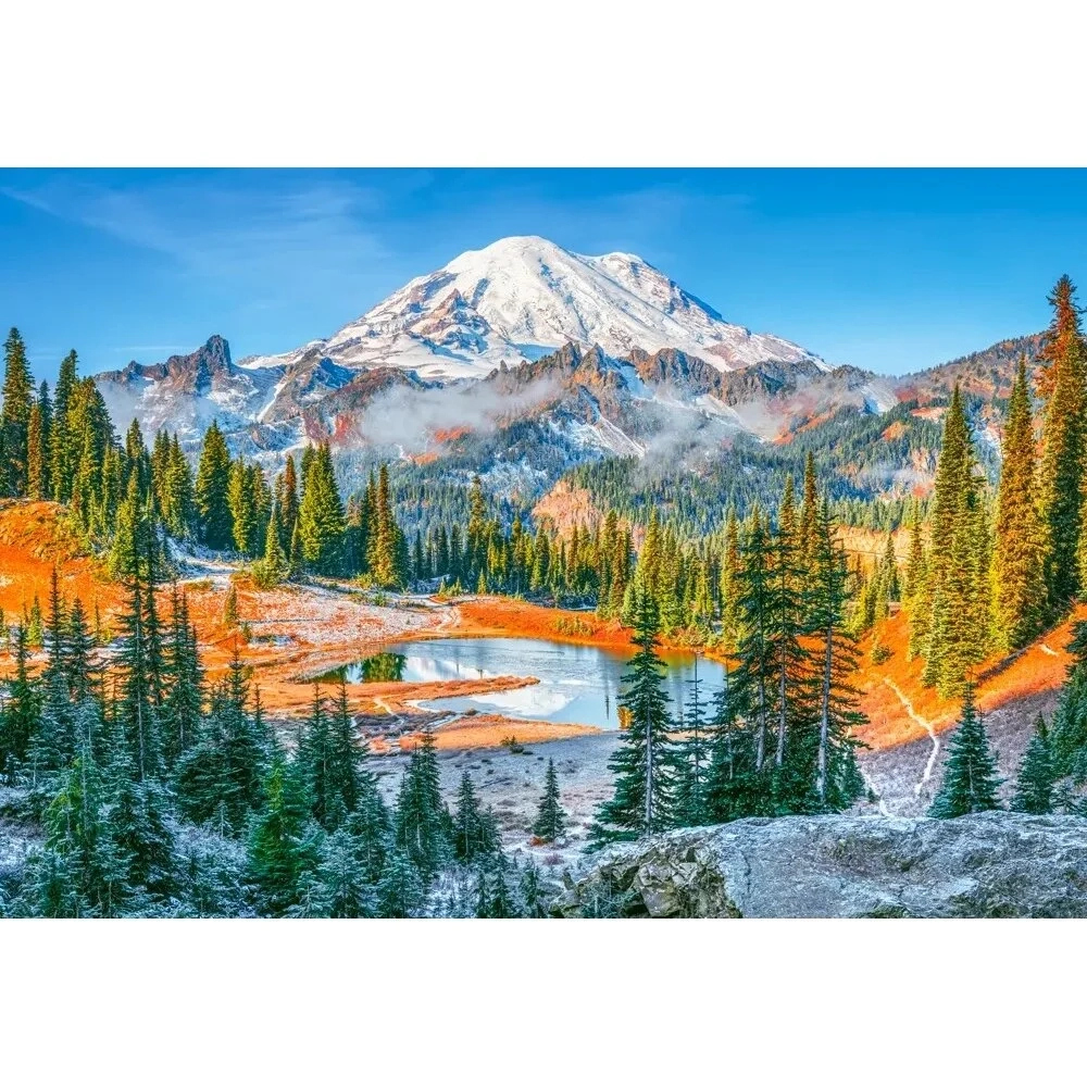 1000 detalių dėlionė, vaizduojanti Mount Rainier nacionalinio parko kraštovaizdį JAV. Įspūdinga snieguota kalno viršūnė, ežeras ir spalvingi miškai sukuria dinamišką, tačiau harmoningą vaizdą, kuris paverčia dėliojimą įtraukiančiu procesu.
