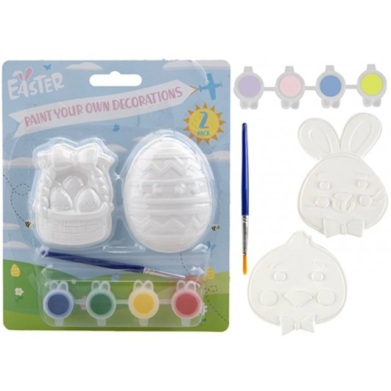 Sukurkite spalvingas ir žaismingas Velykų dekoracijas su šiuo smagiu kūrybos rinkiniu! Rinkinyje rasite viską, ko reikia – 2 skirtingus dekoravimo figūrėlių rinkinius (kiaušinis su krepšeliu arba triušis su viščiuku), 4 ryškias spalvas (geltoną, mėlyną, rožinę, violetinę) bei teptuką.