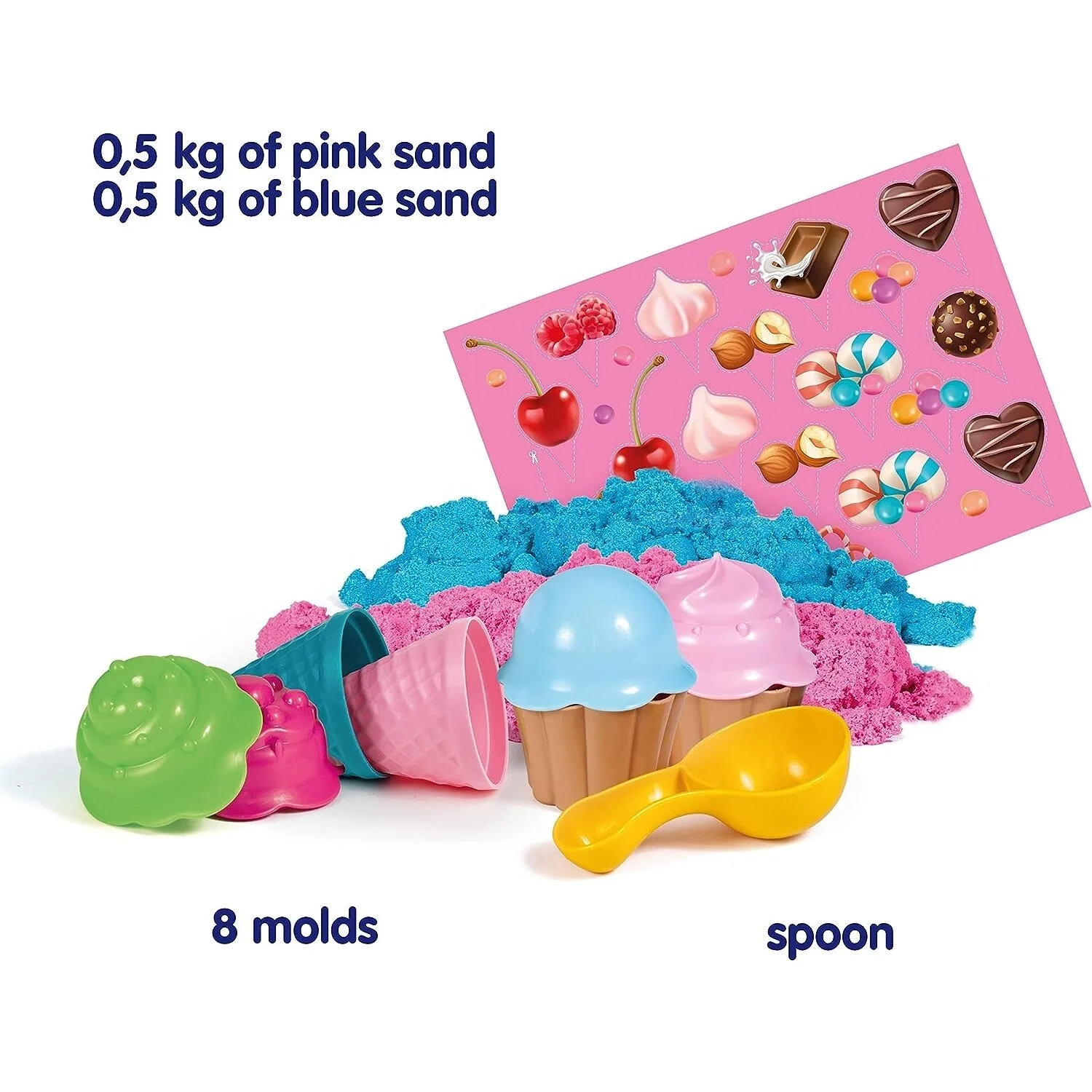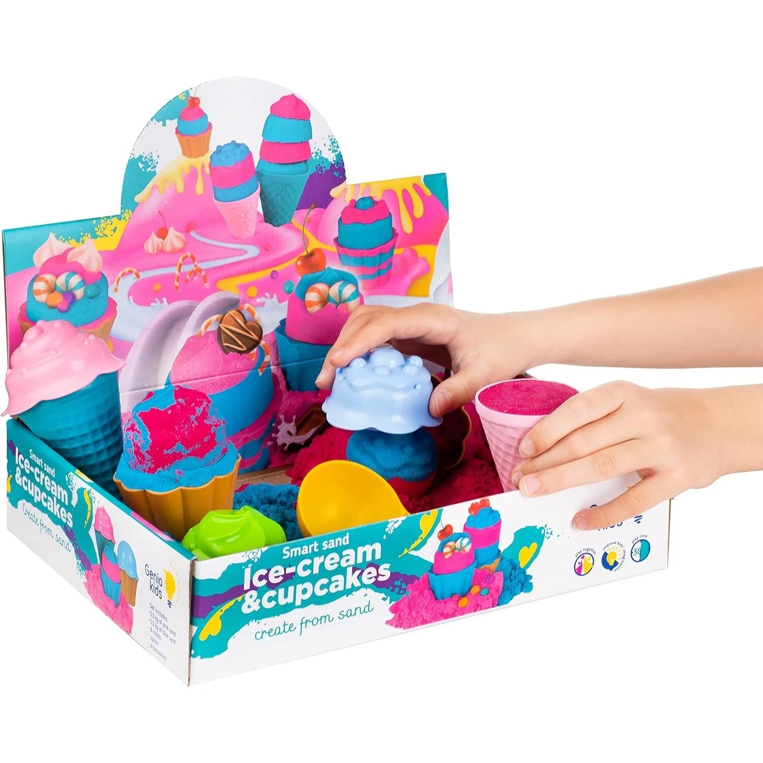 Rinkinį sudaro: rožinis smėlis 0,5 kg, žydras smėlis 0,5kg, 4 plastmasiniai indeliai keksiukams, 4 plastmasinės keksiukų formelės, papuošimai, kuriuos reikia išsikirpti. Dėžutę galima naudoti vietoj smėliadėžės - labai patogu ir praktiška. O dėl dėžutės perforacijos per kelias sekundes smėliadėžę paversite gražiu padėklu. Išmanusis (kinetinis) smėlis gerai klijuojasi, tačiau nelimpa prie rankų, todėl lengvai išsiima iš formelės. Lavina mažąją motoriką ir lytėjimo pojūtį. Puikiai ugdo fantaziją ir kūrybinius gebėjimus. Žaidžiant su kinetiniu smėliu jūsų vaikas atsipalaiduos. Smėlis nepurvina, nelimpa prie rankų, nedžiūsta.