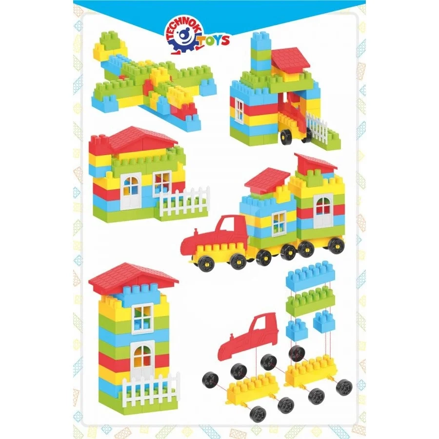 Rinkinį sudaro įvairių formų ir dydžių kaladėlės, langai, durys, tvoros bei kelio ženklai. Taip pat rasite automobilių figūrėles ir platformą su ratukais – puikų pagrindą kurti automobiliams, traukiniams, robotams ar kitiems judantiems modeliams. Tai leidžia vaikams konstruoti namus, pilis, garažus, transporto priemones ir viską, ką tik gali sugalvoti jų fantazija.