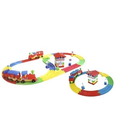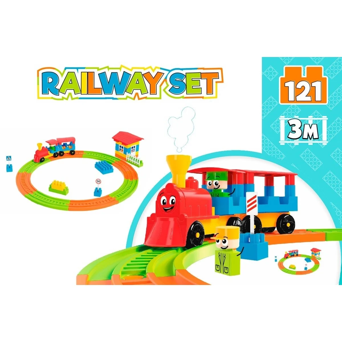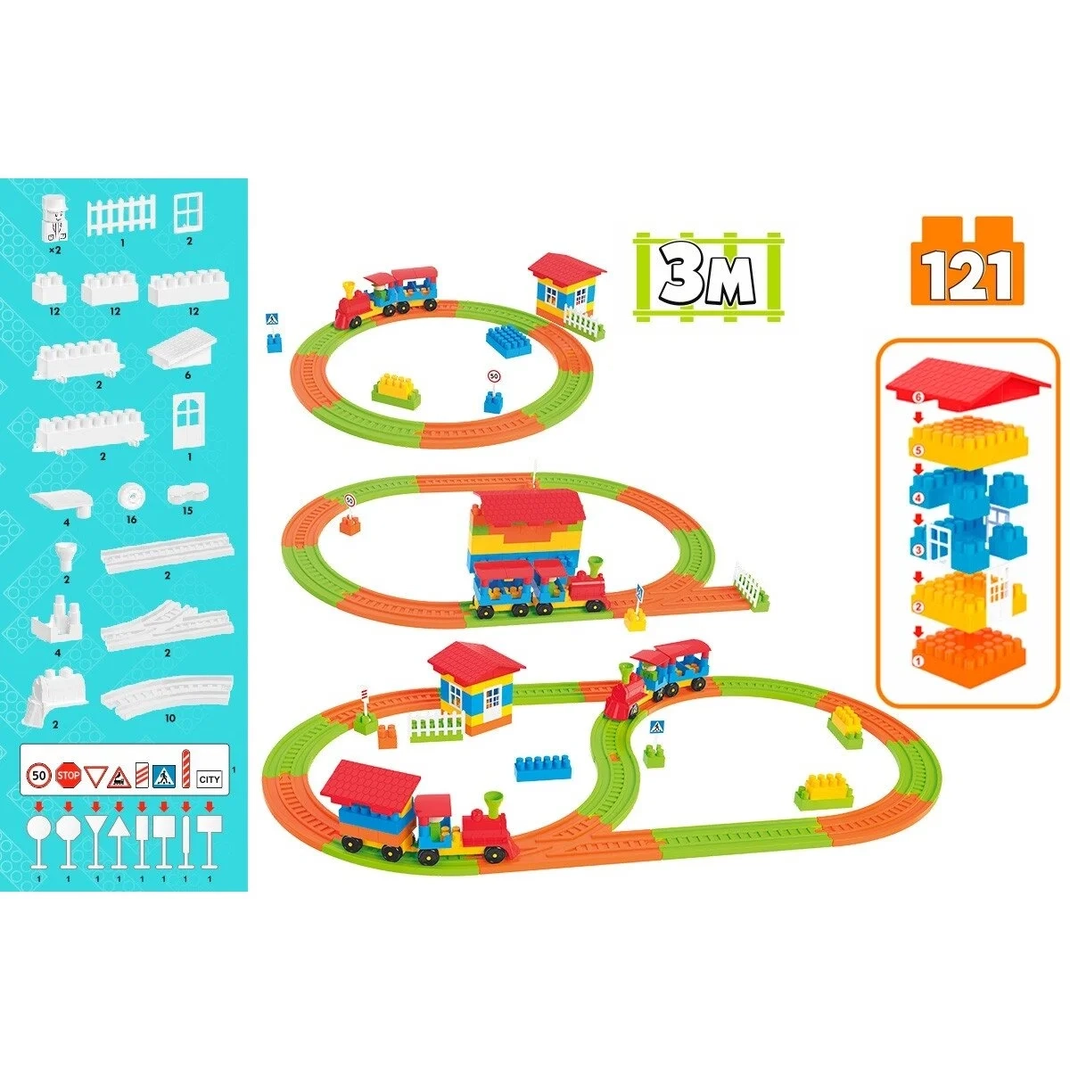 Konstruktoriaus rinkinyje yra: 121 elementas ( traukinys, geležinkėlio bėgiai, vairuotojo figūrėlė, ženklai).