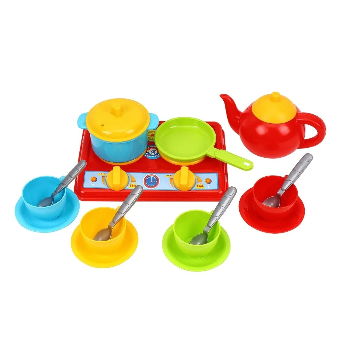 Rinkinį sudaro viryklė, 4 puodeliai, 4 lėkštutės, 4 šaukštai, virdulys, puodas ir keptuvė.