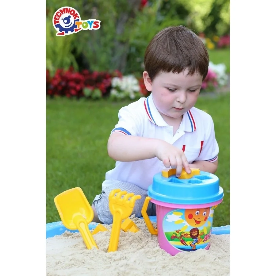 Smėlio rinkinys su kibirėliu, kastuvėliu, grėbliuku, dangteliu - rūšiuokliu ir 6 formemėmis.