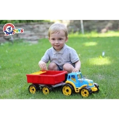 Traktorius su priekaba, skirtas žaisti tiek lauke, tiek namuose.