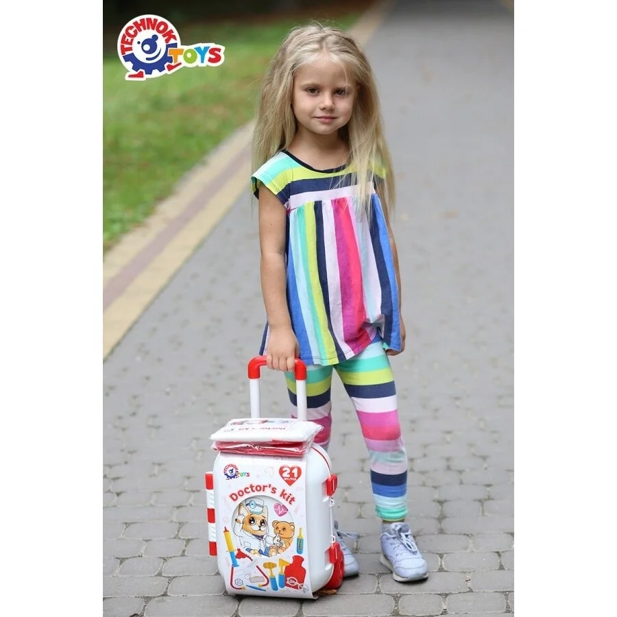 Įspūdingas ir lagaminų turinys: žaisliniai gydytojo įrankiai, stiklainiai su tabletėmis, regėjimo lentelė ir net žaislinis mobilusis telefonas ir tai dar ne visas komplekte esančių žaislų sąrašas. Įsigykite stebuklingą medicininį lagaminą, atidarykite jį ir raskite daug įdomių ir naudingų įrankių, skirtų gydytojų žaidimams.