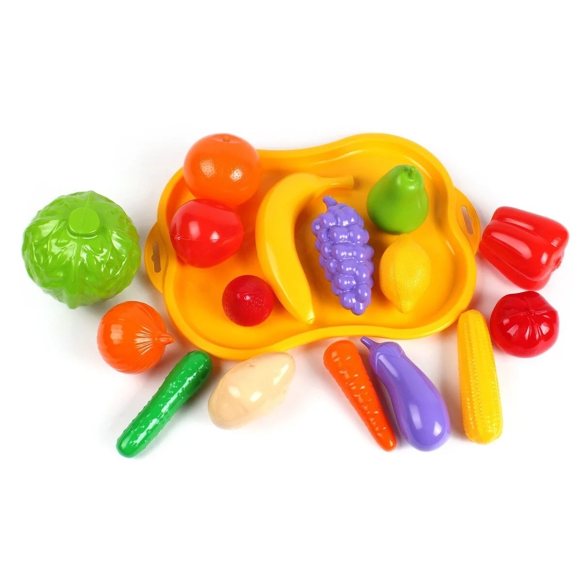 Rinkinį sudaro 16 vaisių ir daržovių ( bananas, citrina, vynuogės, obuolys, kriaušė, kopūstas, svogūnas....) ir padėklas: