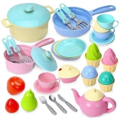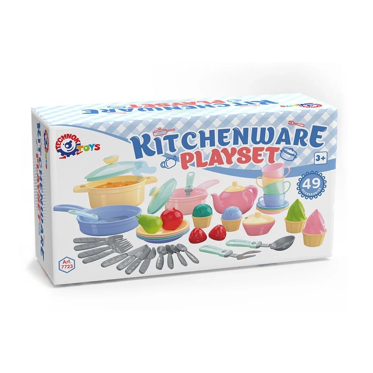 Keptuvė - 1 vnt.; didelis puodas su dangčiu - 1 vnt.; mažas puodas su dangčiu - 1 vnt. šaukštai - 4 vnt.; šakutės - 4 vnt.; lėkštės - 4 vnt.; puodelis - 4 vnt.; lėkštelės - 4 vnt.; keksų formelės - 4 vnt.; daržovės - 4 vnt.; dėžutės - 2 vnt.; virtuvės įrankių rinkinys; cukrinė su dangteliu, arbatinukas su dangteliu.