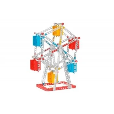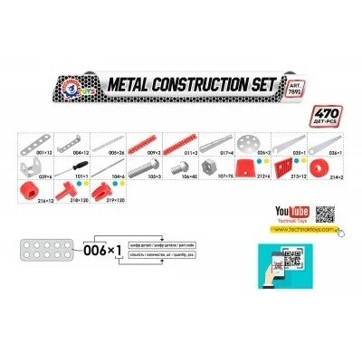 Technok konstruktorius metalinis 470 detalių. Metalinių konstrukcijų rinkinių tradicija prasidėjo tolimajame XVIII amžiuje. Su šiais konstrukciniais rinkiniais užaugo daugybė žinomų išradėjų, mechanikų ir inžinierių kartų. Šio žaislo dėka berniukai (ir net mergaitės) įgyja pirmųjų dalių sujungimo varžtais, veržlėmis, darbo su atsuktuvu ir raktais įgūdžius. Savo rankomis jie kuria tikrus „veikiančius“ modelius: įvairius automobilius, malūnsparnius, kranus, traktorius, traukinius, sunkvežimius, cisternas, motociklus ir daugybę kitų transporto priemonių. Metalo konstrukcijų komplektai TechoK išsiskiria aukšta kokybe ir detalių įvairove, taip pat įdomiu metalinių ir plastikinių dalių deriniu. Kiekviename komplekte yra atsuktuvas ir veržliarakčiai modeliams surinkti. Jauniesiems mechanikams padės spalvingas, išsamus žingsnis po žingsnio instrukcija. Dėžutė 30.2 х 25 х 4.5 cm