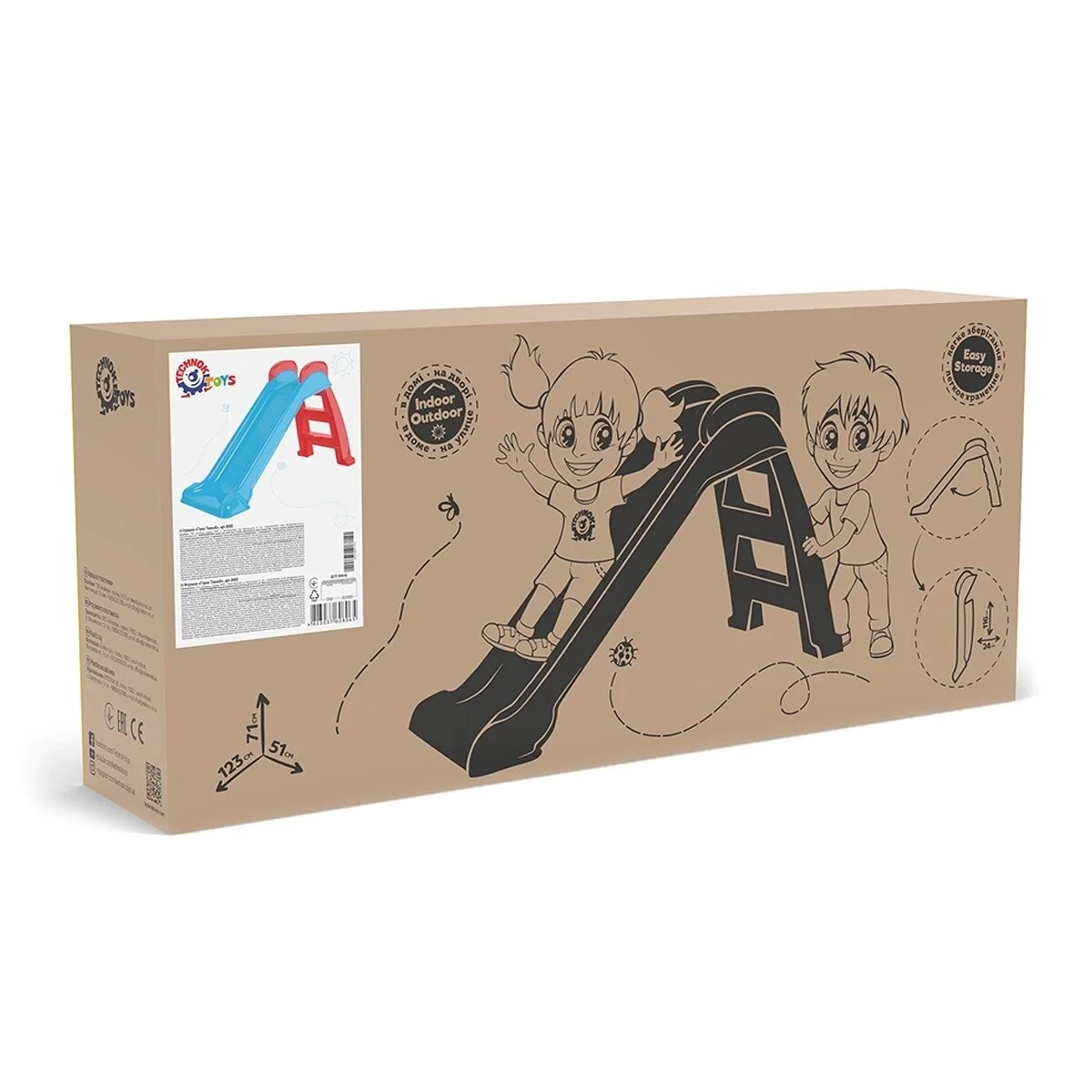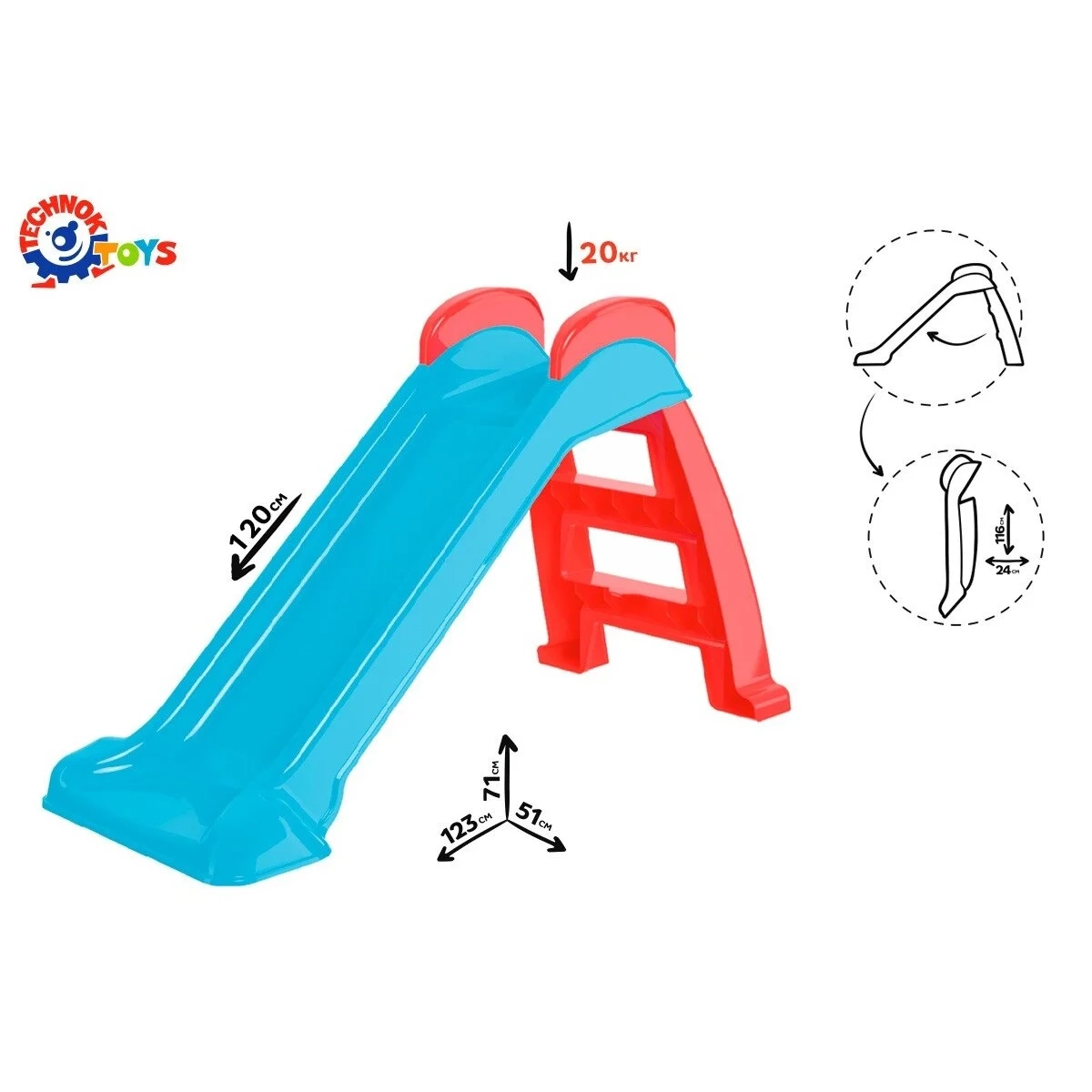 Išskleisto žaislo matmenys: aukštis – 123 cm, plotis – 51 cm, ilgis – 71 cm. Čiuožyklos ilgis – 120 cm.