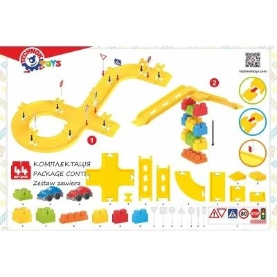 Rinkinyje rasite 44 skirtingus elementus, tokius kaip takai su sankryžomis ir posūkiais, nusileidimai, kelio ženklai ir automobiliai. Konstrukciniai elementai yra dideli ir patogūs mažiems vaikams. Galite statyti įvairias figūras: garažus, automobilių stovėjimo aikšteles, namus, laivus ar gyvūnų figūrėles.