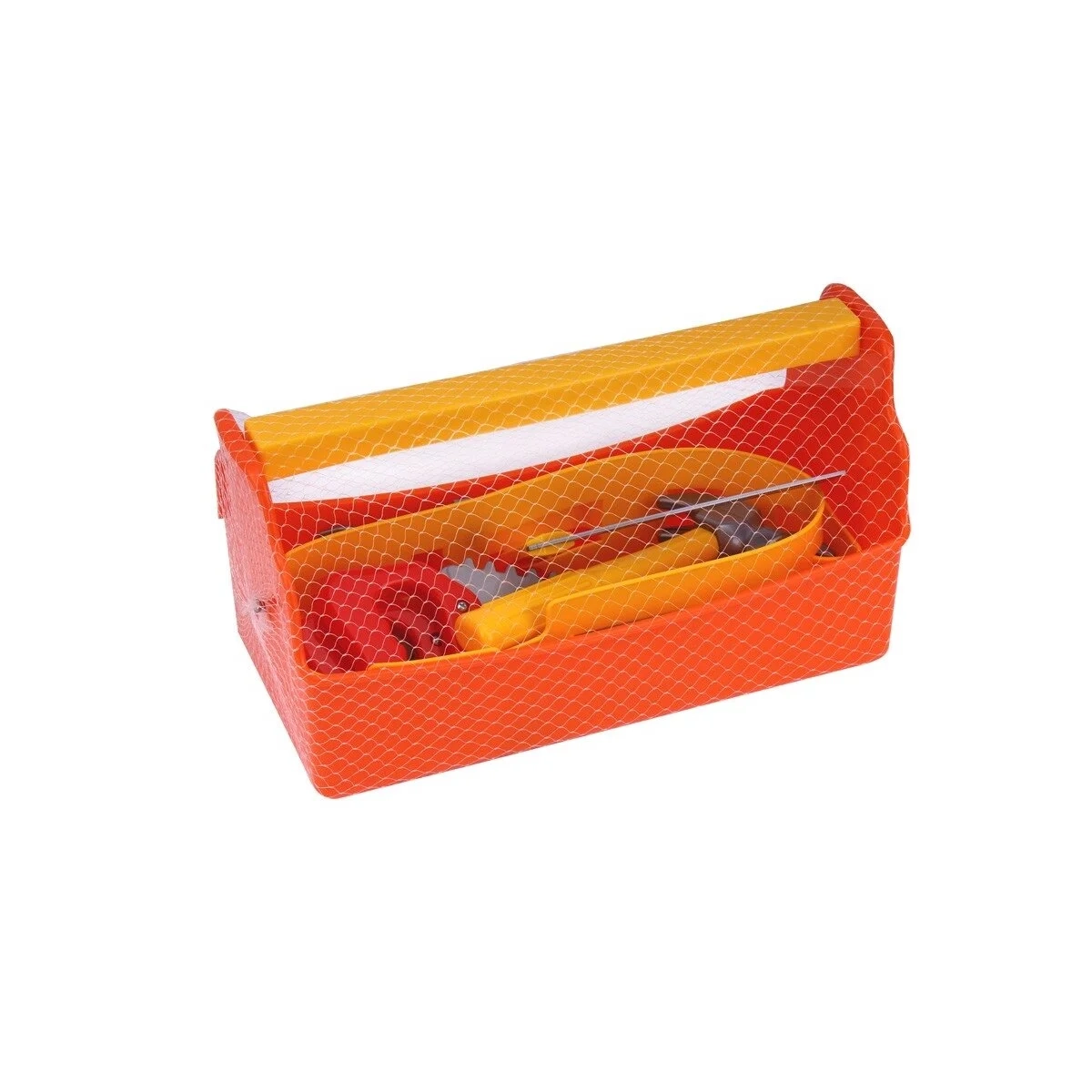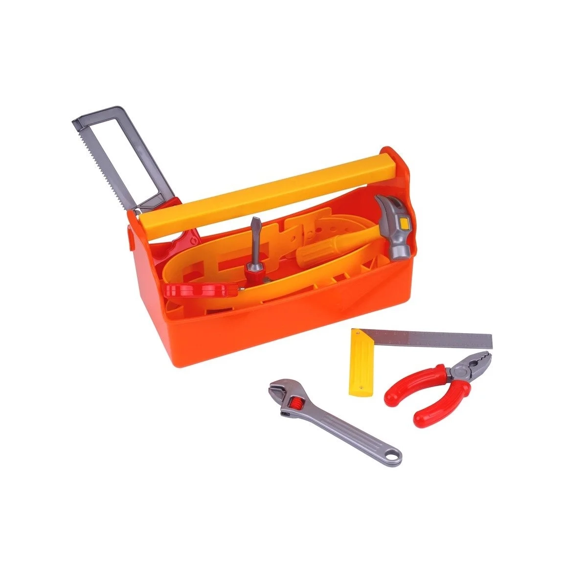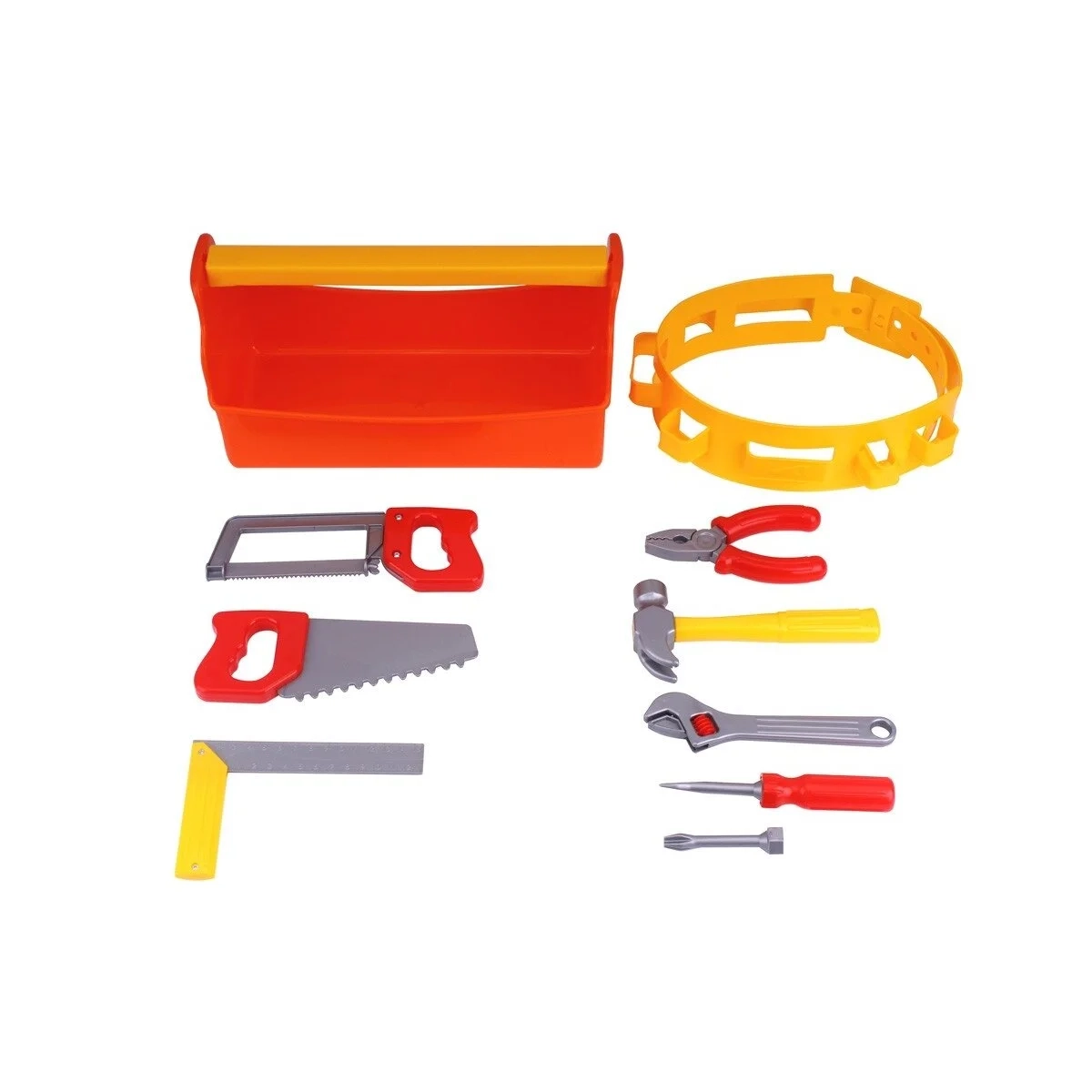 10 vnt: įrankių dėžė, įrankių diržas, plaktukas, pjūklas, replės, pjūklas metalui, pjūklas medžiui, kampainis, reguliuojamas veržliaraktis, atsuktuvas su dviem antgaliais.