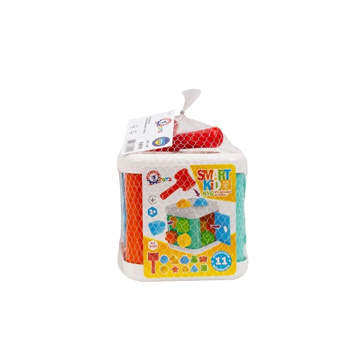 Kubas turi 6 sieneles. Dviejose sienelėse yra durys, kurios atsidaro į kubo vidų, Kubo viduje rasite geometrinių figūrų ir gyvūnų figūrų. Vaikas gali išimti figūrėles ir įdėti jas atgal į atitinkamas ertmes. Kitoje pusėje yra dvi ertmės, kad vaikas galėtų su plaktuku įkalti kamuoliukus į kubo vidų.