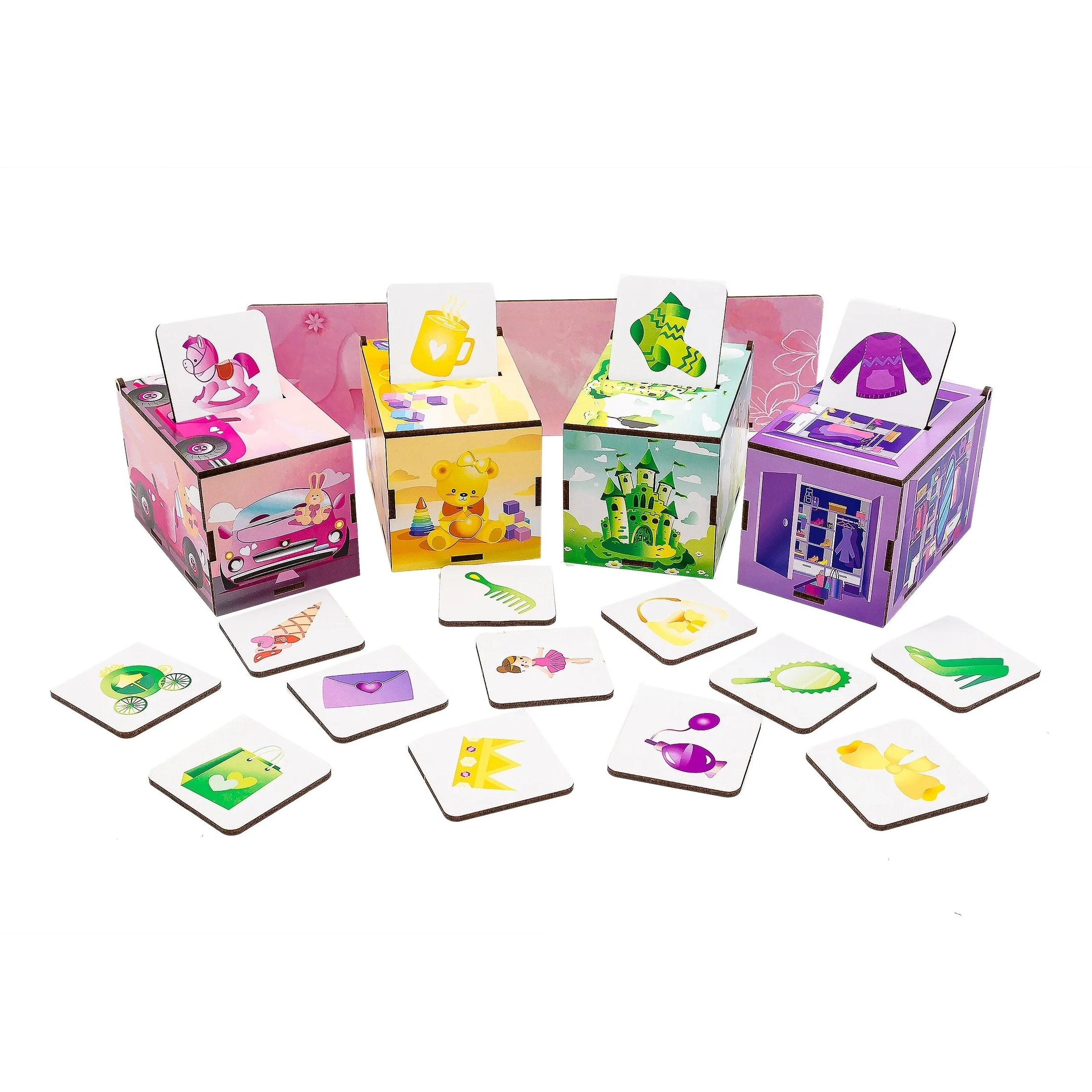 Rinkinys susideda iš keturių spalvingų dėžučių bei 40 kortelių su įvairių objektų paveikslėliais, kurios suteikia vaikui galimybę lavinti dėmesį ir atmintį.